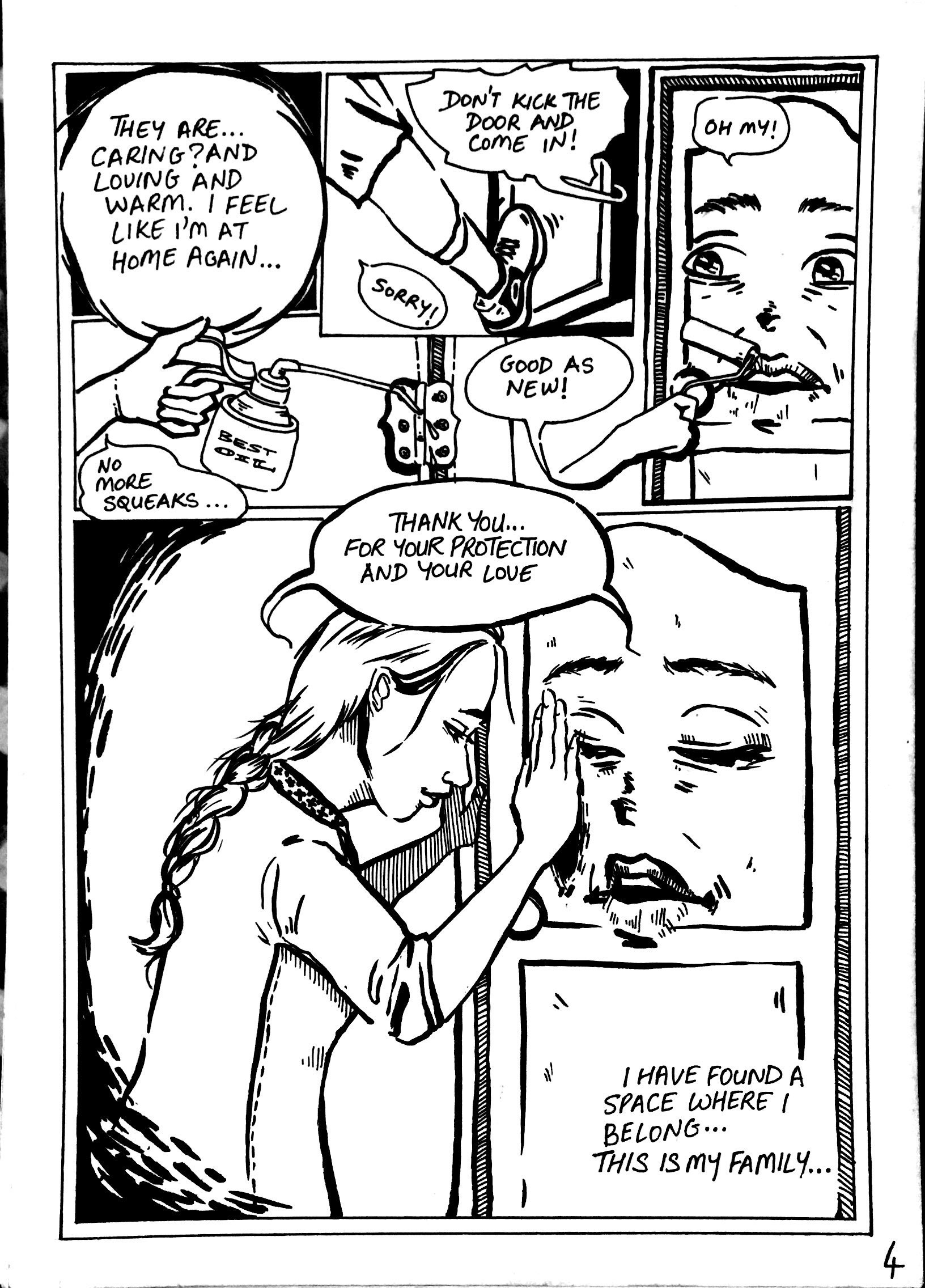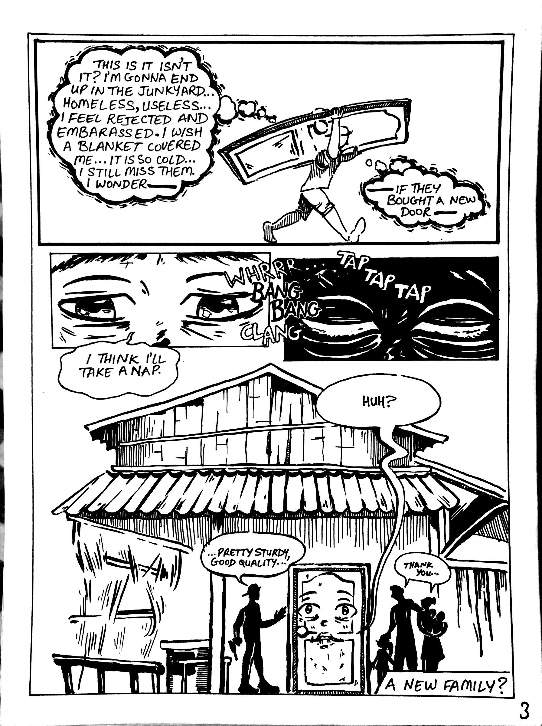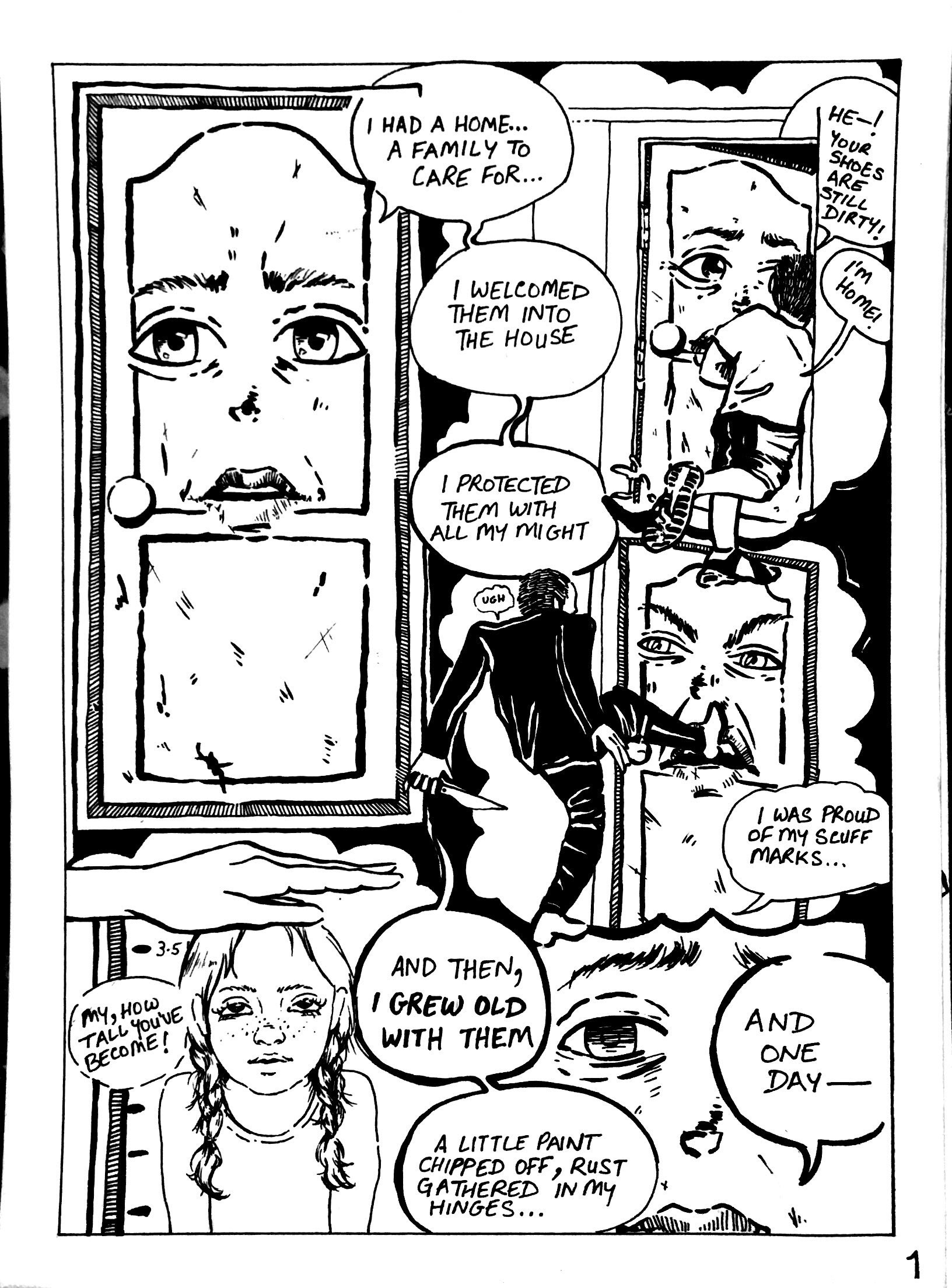 A four page graphic novel illustrating the concept of home and what it feels like to be away from home through the eyes of an inanimate object. The story is narrated by a door who is forcefully removed from his home and cast aside. The door experiences the complex emotions of abandonment before finding and accepting a new family.